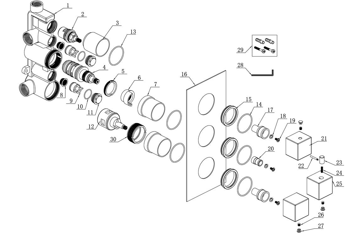 - Serves as a replacement for the DICM0174 Kuba Thermostatic Three Outlet Triple Shower Valve, now discontinued